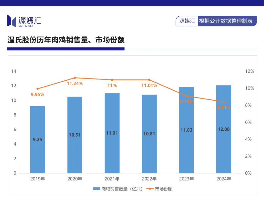 過去幾年,温氏股份的市場份額正在快速下滑,從2021年的11%下降至2024年的8.41%,市場佔有率雖居上市企業首位,但已經跌破近幾年新低。