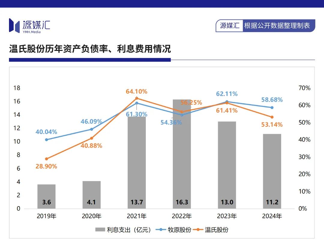 很有可能,新模式不只帶來高額的折舊與攤銷費用,還致使温氏股份債務暴漲並面臨高昂利息支出,資產負債率從2019年的28.9%上升至2024年的53.14%,峯值一度達到64.1%;利息費用則從3.6億元飆升至11.2億元,峯值為16.3億元。