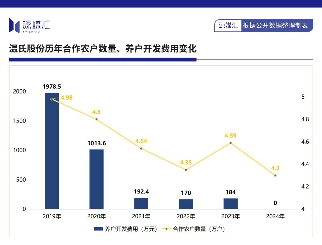 過去幾年時間裏,温氏股份合作農户數量不增反降,從2019年的4.98萬户逐年流失至2024年的4.3萬户。**這很有可能與其不斷削減養户投入資金有關。**同期,養户開發費用從近2000萬元減少至0元。