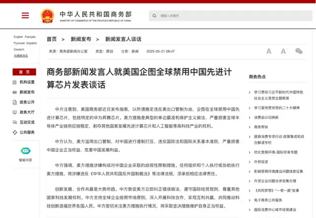 15日商務部例行新聞發佈會上,中方已就相關問題闡明嚴正立場。今日,商務部新聞發言人就美國企圖全球禁用中國先進計算芯片發表談話。