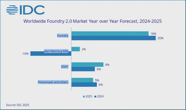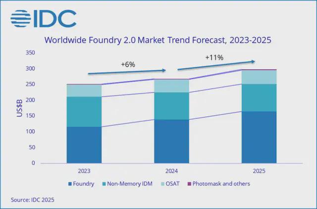 IDC預計,全球半導體市場在經歷2024年的復甦之後,預計在2025年有望迎來複蘇。廣義的晶圓代工2.0(Foundry 2.0)市場,包括晶圓代工、非存儲器IDM、封裝測試以及光罩製作,在AI需求持續增長以及非AI需求緩慢回温的催化下,預計2025年市場規模將達2,980億美元,年增長11%。