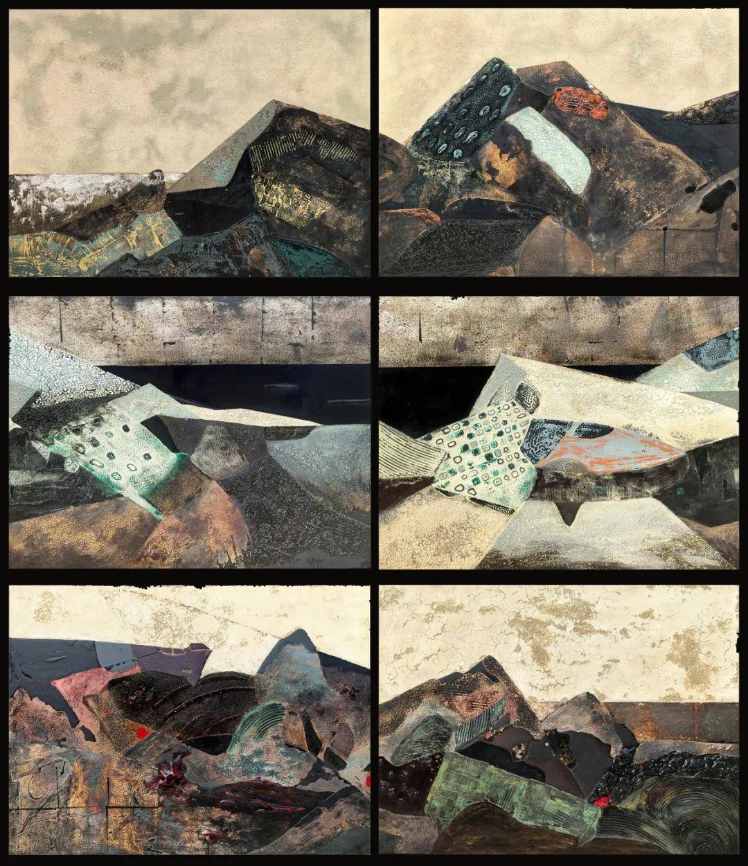 當多數漆畫家困守傳統工筆範式時,葉國才已在抽象領域劈波斬浪。《遠山系列》堪稱漆畫版的“抽象山水宣言”:他摒棄“三遠法”的程式,以幾何塊面重構山水意象。各種土地顏色的漆塊堆疊出山巒的厚重,極細的漆線勾勒則如傳統畫中的“披麻皴”,在抽象與具象間構築起微妙平衡。這種創新暗合吳冠中“風箏不斷線”的藝術理念,正如他在探討“如何創作一幅好的漆畫作品”時所言:“漆畫的抽象不是無病呻吟,而是用材料的語言説出山水的心跳。”