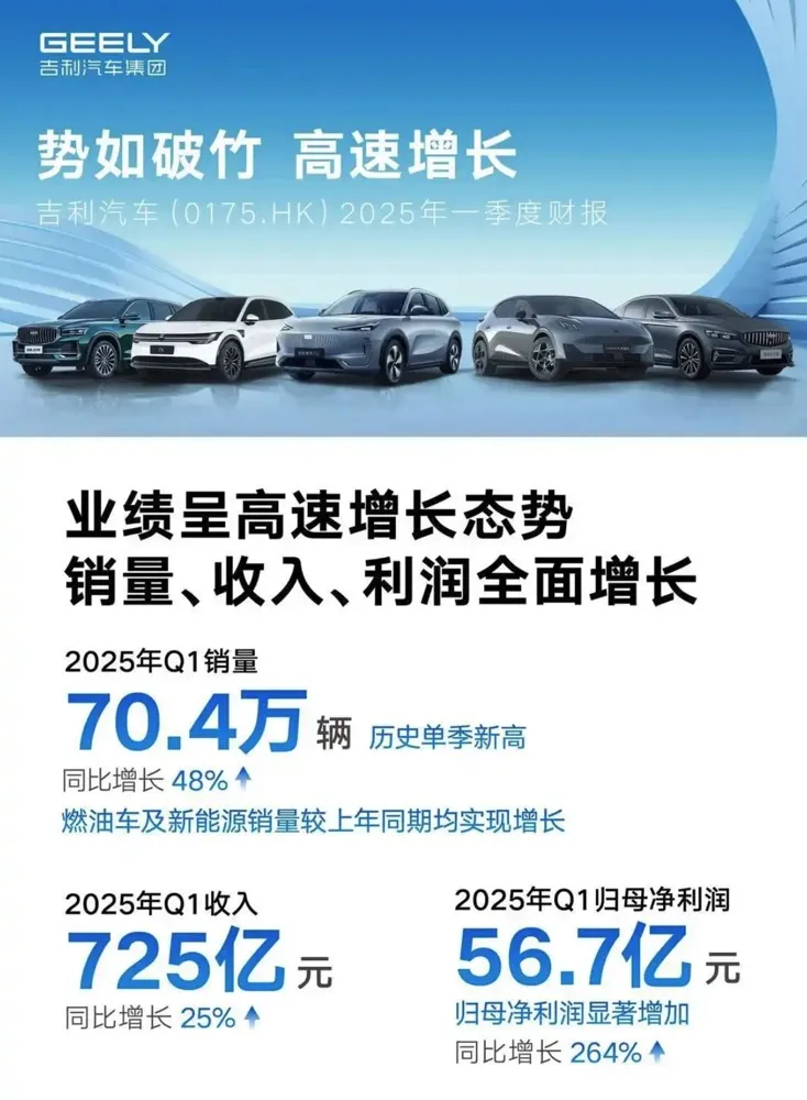 近日,吉利發佈一季度財報:第一季度銷量達70.38萬輛,同比增長48%,年目標達成率為26%;同時,吉利實現營業收入725億元,同比增長25%;歸母淨利潤56.7億元,同比增長264%。