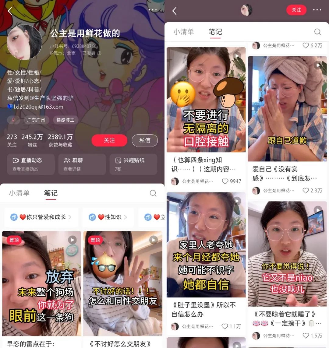 小紅書雖未上線知識區,但基於用户對於兩性話題的關注,一些性科普賬號應運而生,比如單月小紅書漲粉90萬的“公主是用鮮花做的”,專注科普性知識,教女生如何正確認知和理解“性”這件事,分享各種戀愛觀點。