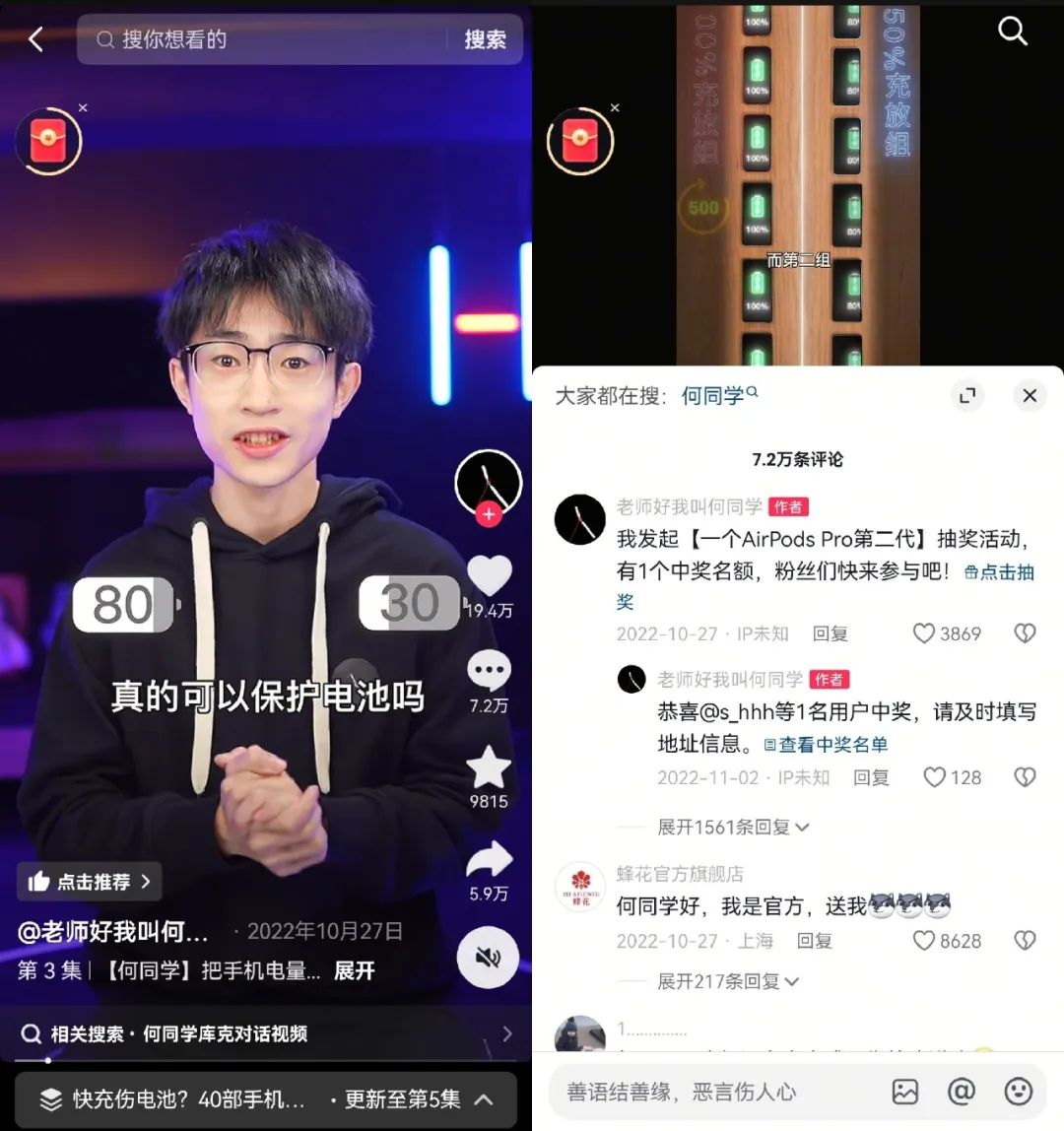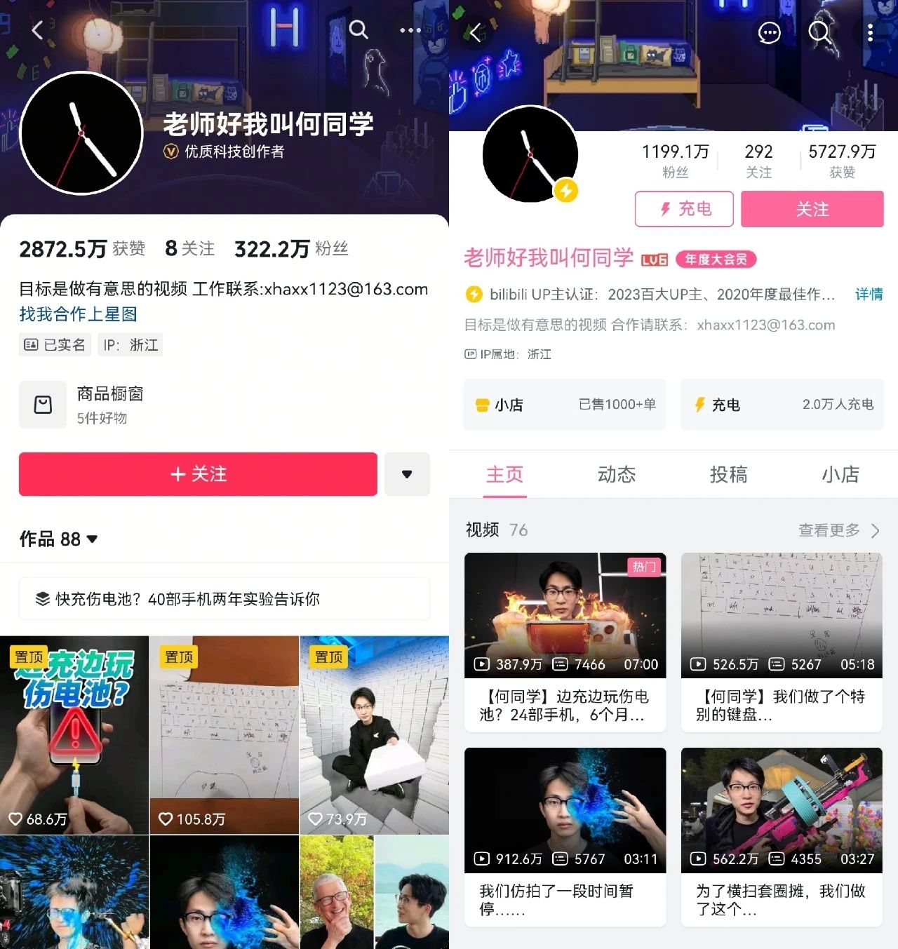 2022年10月,何同學在抖音發佈了首條視頻,將此前發於B站9分27秒的原視頻進行了拆解和重新剪輯,做成1分鐘以內的豎版短視頻,使其更適配抖音的播放模式。