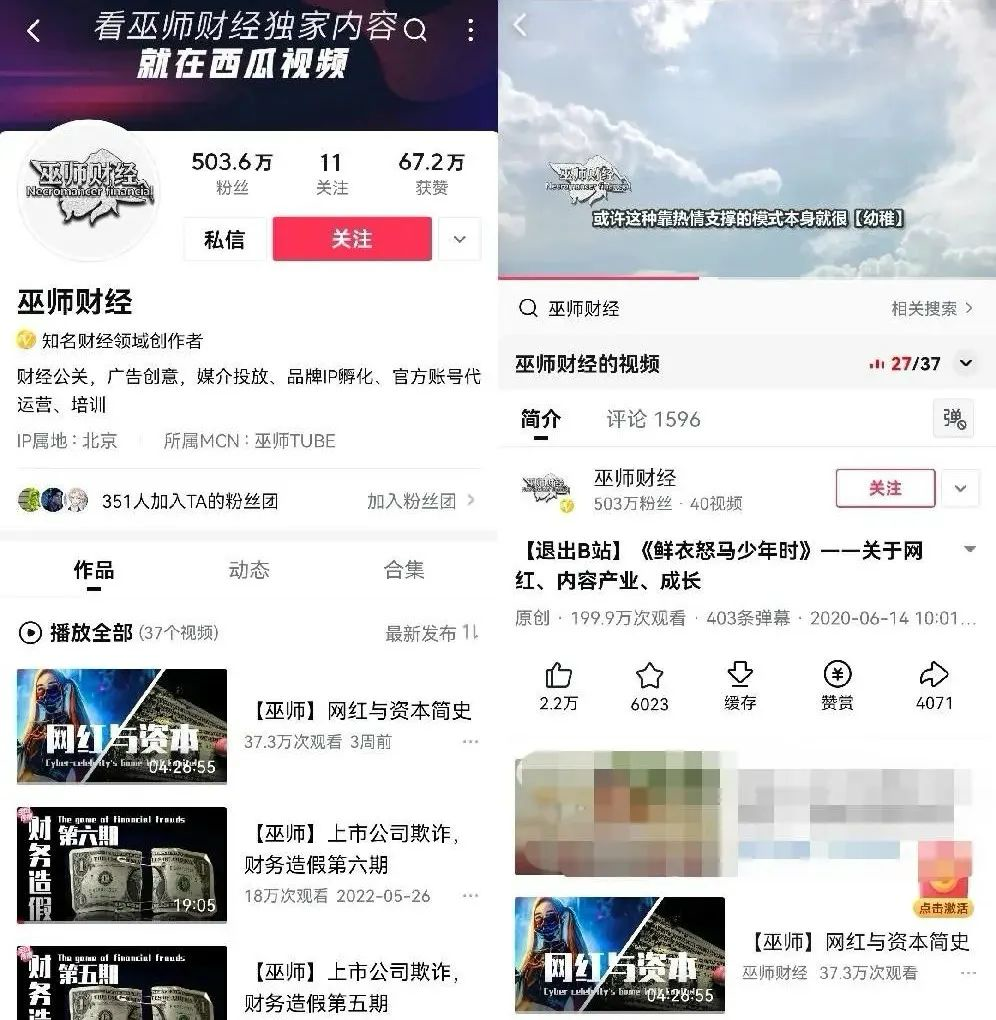 2020年6月,擁有310萬粉絲的知名財經知識類UP主“巫師財經”發佈視頻宣佈與B站分道揚鑣,選擇投身西瓜視頻,成為獨家創作者。但耐人尋味的是,僅在2年後,“巫師財經”選擇在2022年8月選擇迴歸B站,原因或許出在他在西瓜視頻的不耐受,雖然在2年時間內積累了503萬粉絲,獲贊數累計僅67.2萬。