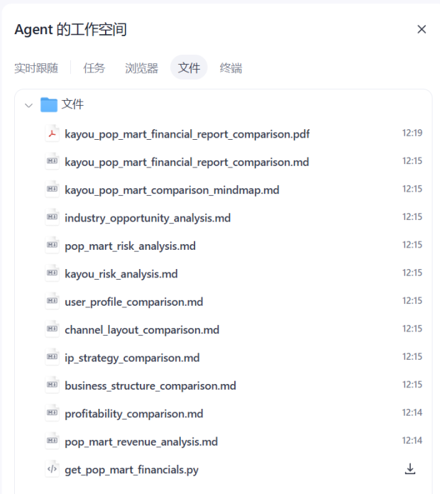 它是釦子最新的 AI Agent 平台,可以自動創建多個並行的任務,高效地爬取和分析不同的信息,我們用它做了一份卡遊和泡泡瑪特的數據對比報告。