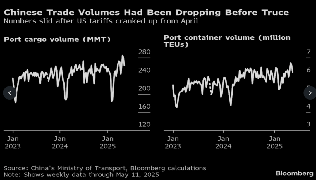 中美兩國削減貿易關税的協議預計將推動運費上漲,因為企業正爭相利用90天的寬限期將貨物運往太平洋彼岸(圖源:彭博社)