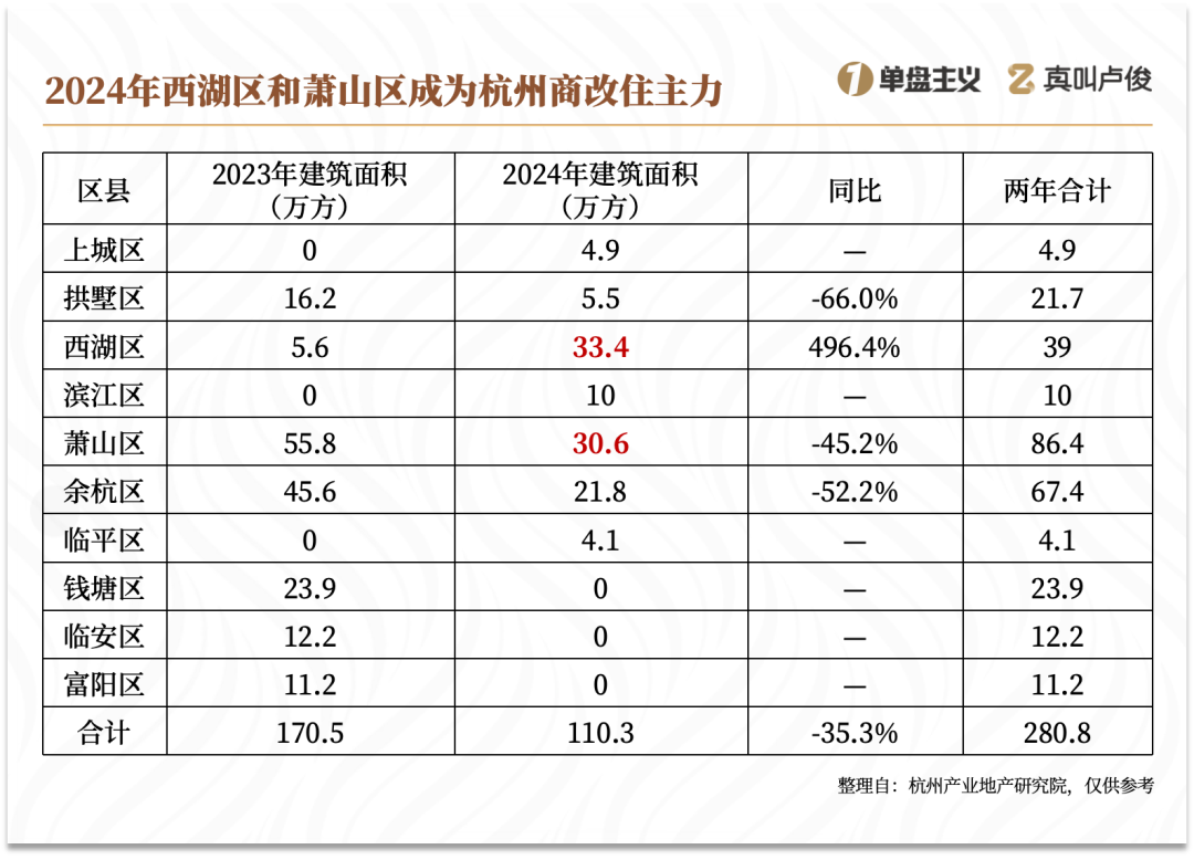 其中西湖區和蕭山區是商改住的主力,分別有33.4萬方和30.6萬方