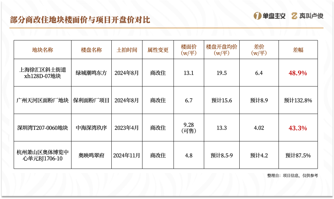 我們看到建在這些商改住地塊之上的住宅,無一例外不是區域塔尖,體現在銷售單價上比之前期的樓板價