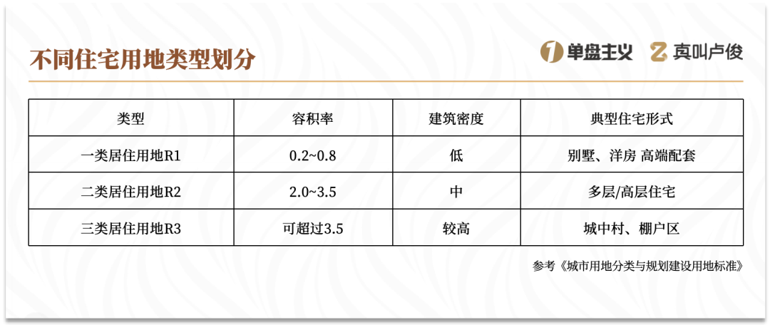 一類居住用地R1則是容積率在0.2-0.8的低密別墅、洋房,三類R3更多是高密度的城中村或棚户區,涉及城市更新的地塊
