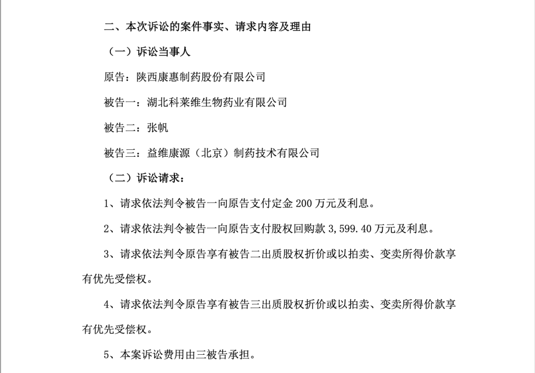 在《訴訟公告》中,康惠製藥列舉了其五點訴訟請求:請求依法判令科萊維向康惠製藥支付定金200萬元及利息;請求依法判令科萊維向康惠製藥支付股權回購款3599.40萬元及利息;請求依法判令康惠製藥享有張帆出質股權折價或以拍賣、變賣所得價款享有優先受償權;請求依法判令康惠製藥享有益維康源出質股權折價或以拍賣、變賣所得價款享有優先受償權;本案訴訟費用由三被告承擔。