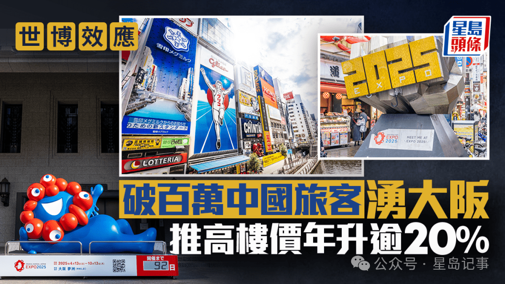 大阪關西世博會吸引全球旅客,受惠日本對華簽證政策放寬外,加上中日之間的國際航班相應增加,令今年首季前往日本大阪的中國遊客達到127萬人,更突破歷史新高紀錄。除了遊客不斷上升,定居在大阪的中國人亦越來越多,更推高當地樓價,去年大阪樓價更上升逾20%。