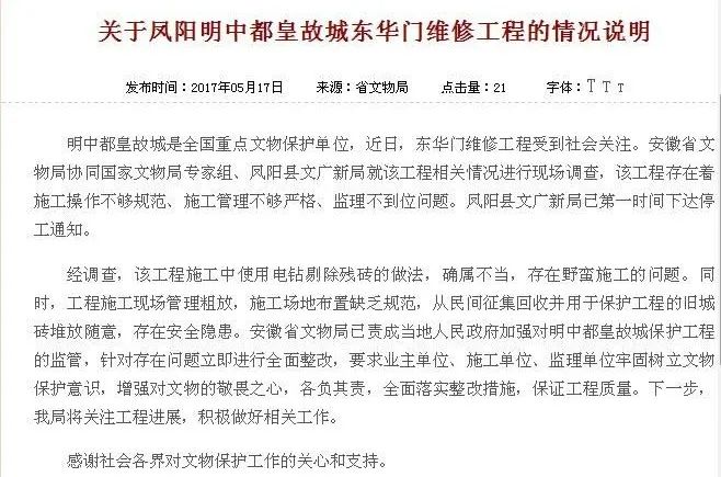 只不過第二天下午,安徽省文物局又站出來説,確實存在野蠻施工,已經責令整改。
