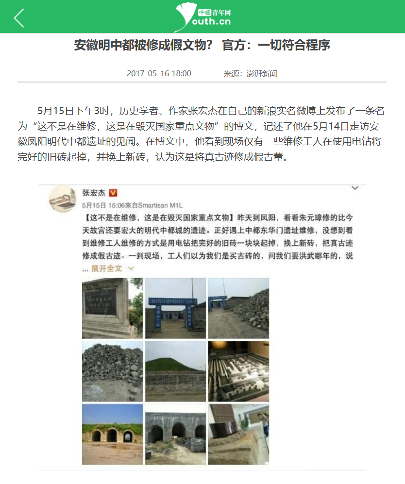 2017年,鳳陽明中都東華門遺址維修,歷史學者張宏傑在微博上稱: