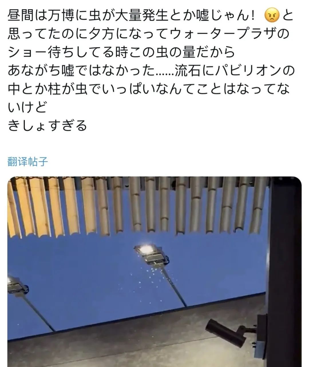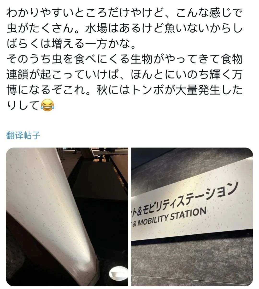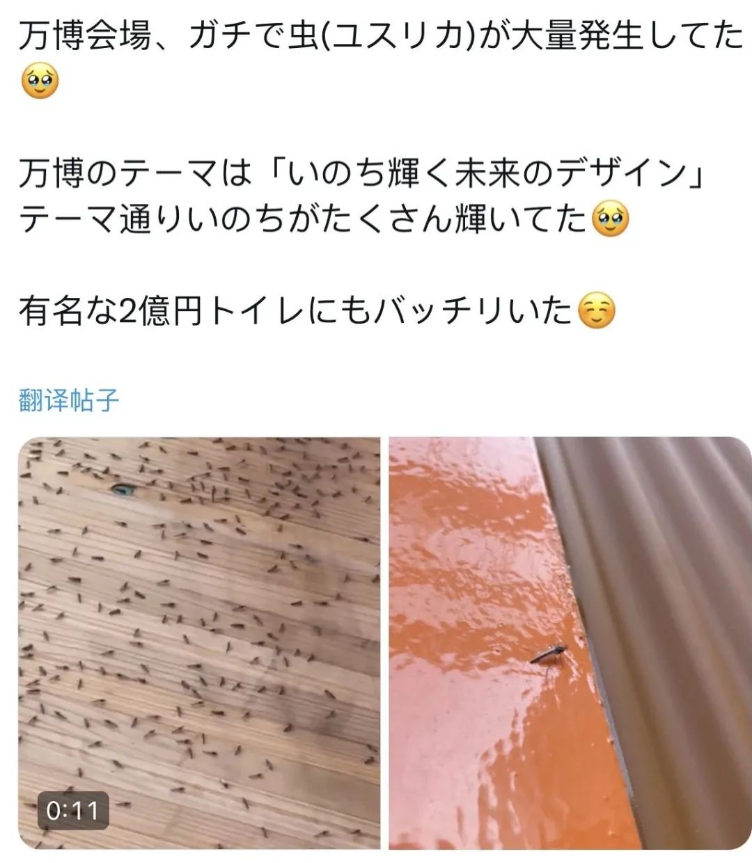 **“萬博會場真的出現了大量蟲子(疑似搖蚊),**本屆世博會的主題是‘生命閃耀的未來設計’,還真是名副其實,各種生命閃閃發光了啊。就連那個著名的‘2億日元廁所’裏,也毫不例外地出現了蟲子。”