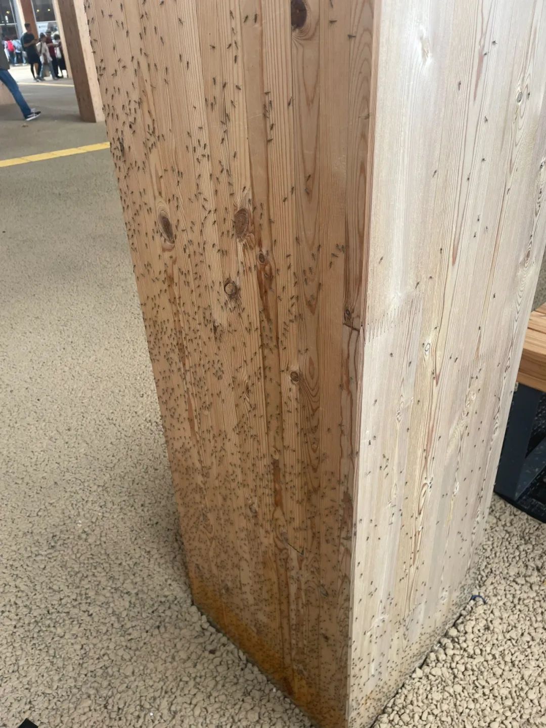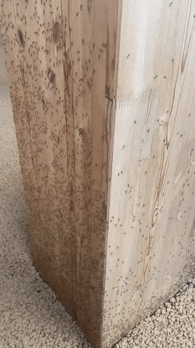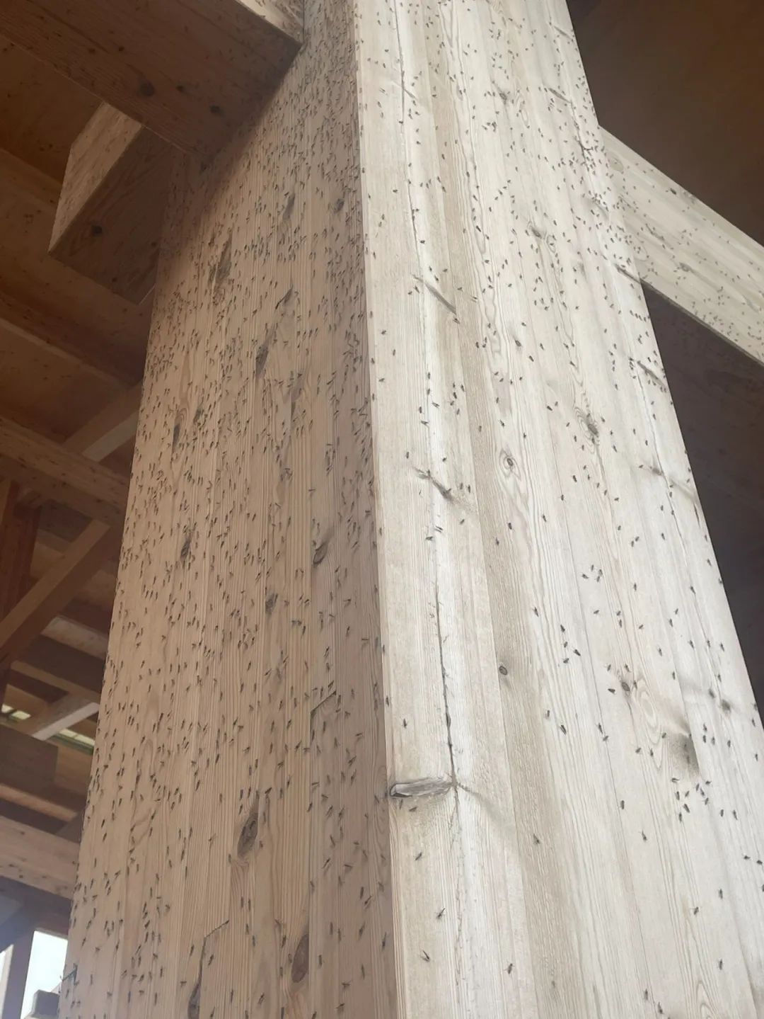 可以看到,木頭立柱上密密麻麻爬滿了蟲子。