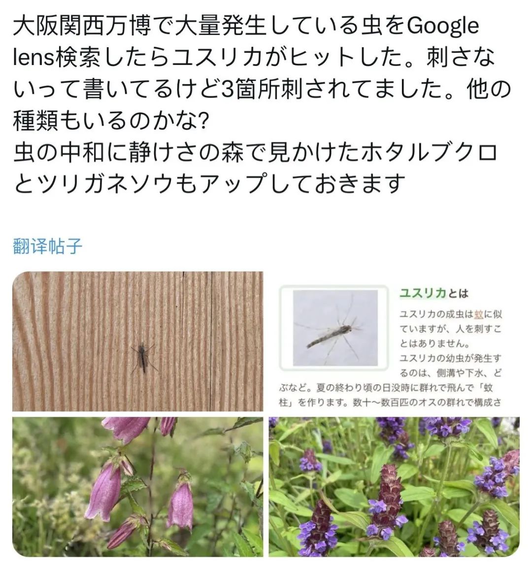 在大阪關西世博會上大量出現的蟲子,我用Google Lens查詢後結果顯示是搖蚊。儘管資料表明搖蚊不會叮咬人類,但我卻發現自己被叮了三處。這是否意味着這裏還存在其他類型的蟲子呢?此外,在‘靜謐森林’區域,我還發現了螢火蟲和瓶子草,現在將拍攝的照片也一併上傳。