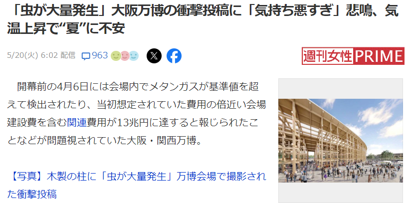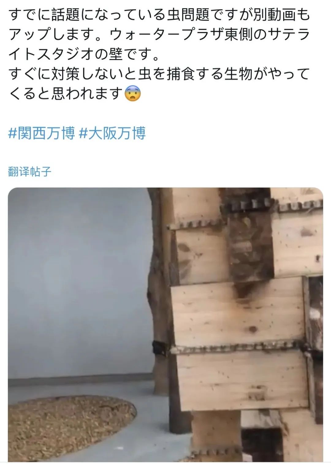 隨着夏日臨近氣温升高,在户外舉辦的活動也越來越容易遭遇蟲害問題。自從邁入5月中旬,日本的社交平台上就出現了不少關於“世博會 蟲羣”的討論,網友紛紛跟帖現身説法,諸如“確實如此”、“園區內蟲子數量驚人”,“蟲子數量多到讓人感到不適”的帖子層出不窮。
