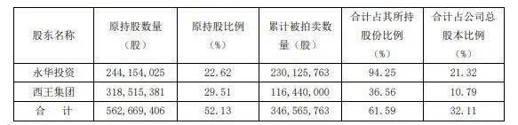 西王食品5月16日發佈的公告顯示,截至公告披露日,公司股東西王集團、永華投資累計被拍賣的股份合計約3.47億股,佔西王食品的股本比例為32.11%。
