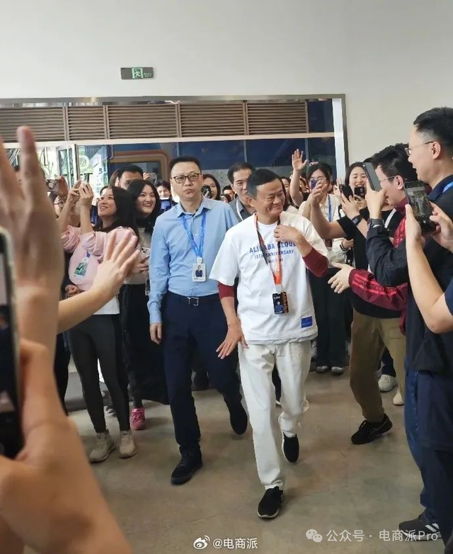 4月10日當天,正值阿里雲15週年紀念日,馬雲身穿白色T恤,佩戴了阿里新版工牌,衣服還印有“阿里雲15週年紀念日”的英文字樣。
