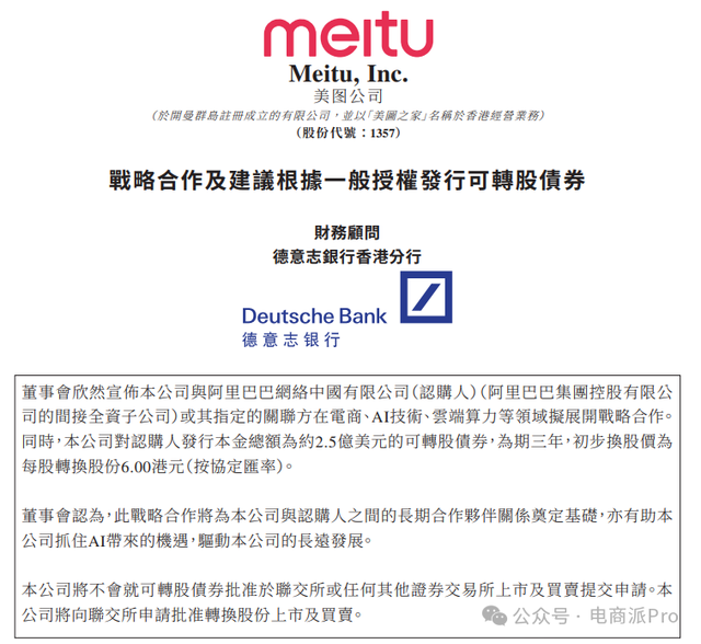 近日,阿里巴巴與美圖公司達成戰略合作,以可轉債的形式投資美圖。據美圖公司發佈的公告,可轉債協議本金總額約為2.5億美元(約合人民幣18億元),為期3年,年利率為1%。