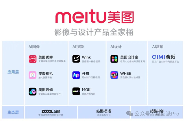 此外,美圖還有其他各種AI工具,比如AI視頻工具Wink、開拍、MOKI,以及AI設計工具WHEE、美圖設計室等。