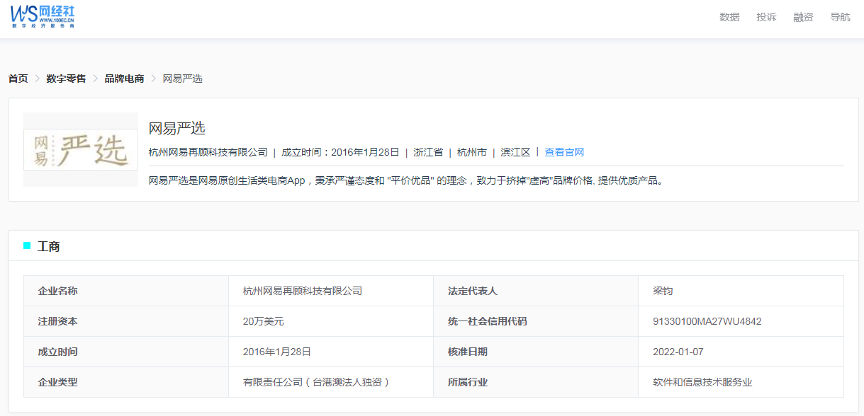 網經社企業庫顯示,網易嚴選隸屬於杭州網易再顧科技有限公司,該公司成立於2016年1月28日,註冊地址為浙江省杭州市濱江區,法定代表人為梁鈞。
