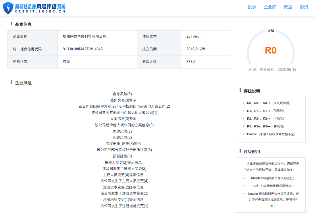 據“網經社企業風險評級系統”顯示,網易嚴選所屬杭州網易再顧科技有限公司的風險評級為R0,公司目前所處未發現風險。