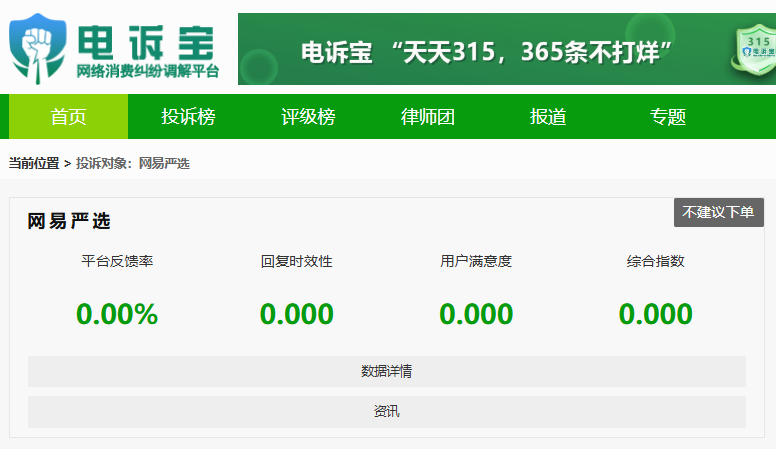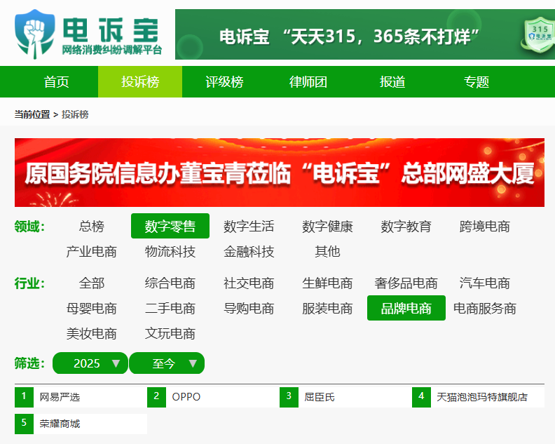 根據“電訴寶”受理的數字零售領域中品牌電商用户有效投訴顯示(依據投訴量排行),網易嚴選排名第1位。最新評級為**“不建議下單”**。除此之外,2023年同樣被投訴的數字零售領域平台還有:oppo、屈臣氏、天貓泡泡瑪特旗艦店、榮耀商城等。