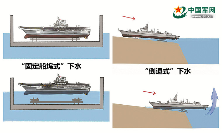 “固定船塢式”下水。固定船塢一般都建在水邊,軍艦在船塢裏建好後,把水直接引進船塢,軍艦依靠自身浮力浮起,然後利用外部動力將其拖出,下水就完成了。這種方式適合航母等大型軍艦。2013年下水的美國 “福特”號航母和剛剛下水的中國首艘國產航母都採用了這種方式。