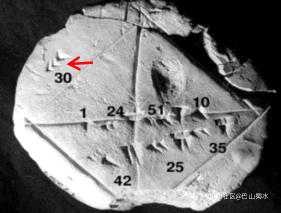 **右圖是巴比倫楔形泥板文字,鐵證證明3個<符號是10累加,表示數字30的依據。泥板上面數字是原圖。**這麼多年,我們眾多專家教授觀察不仔細,一直説三星堆文物沒文字。事實上,有文字,是因眾多專家教授不認識古波斯楔形文字造成的誤斷。