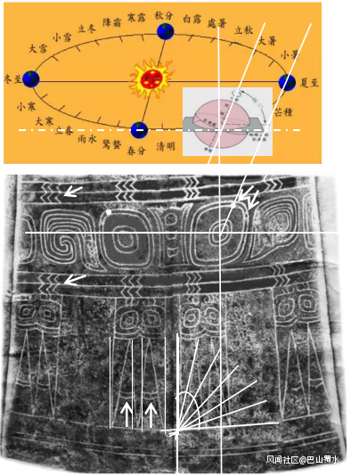 細看:大橢圓傾斜頂端箭頭所示有兩個點,代表太陽、月亮,外大橢圓表示蒼穹,內大橢圓表示太陽月亮在天空運行軌跡。設計工程師通過此圖形表達當時已算很先進的“地心説”原理:中心小橢圓是地球,對應大橢圓是太陽月亮運行軌道,太陽月亮繞地球轉。注意:2500年前中國時空觀是“天圓地方”,雖然2300年左右,屈原在《天問》中曾對天圓地方説提出質疑,知道天不是圓,地不是方,但沒扳倒天圓地方説,一直成為中國主流時空觀。古波斯工程師厲害的是:他知道地球不是方的,也不是圓的,是橢圓的;太陽月亮與地球相對運行,軌跡也是橢圓的。所以他設計出大橢圓套小橢圓,表示太陽與地球之間運行關係。更厲害的是:現代科學測定,地球赤道半徑a=6378137米;地球極半徑b=6356752米;****赤道半徑比南北半徑多出21385米,直徑多出43公里(扁橢圓),他在2500年前就知道了。特別厲害的是:他不但知道地球是橢圓,還知道地球傾斜23.5度運行,他設計的圖形中地球橢圓傾斜角度恰好與現代天文學測出地球傾斜度吻合(兩線平行同位角等,不可能巧合得那麼準)。如頂端傾斜角箭頭所示:太陽軌跡定點標註角度,恰好在太陽照射在赤道——秋分與春分對應均分點。太陽運行在在這兩個均分點,白天和黑夜時長是精確對半的。這就恰好解釋了他在下圖中,為何要以此點為對分基準點,把每個月細分成30個白天,30個夜晚(不像我們現代人籠統把1個月説成是30天)。注意:圖中的<符號,是巴比倫文10的意思,3個<<<,是用巴比倫數字10疊加代表30,意思是每月30個白天,30個夜晚疊加,3條緯線中線劃分白天夜晚。下面4組小圖加上面2組解釋大圖共6組,背面也有6組,共12組,代表一年中有12個月。每組表示1月(30上下疊加,表示1月有30個白天,30個夜晚)。上面2組大圖形是方便人們看懂,解釋下面4組小圖形,表達意思一樣。該工程師熟悉幾何學原理,下面多個尖角,採用兩線平行,內錯角等原理,表示太陽圍着地球轉1小時,轉動15度,半天12小時180度(圖中90度六等分,是作者方便朋友們理解1小時轉動15度,按銅像設計工程師畫出的尖角角度,補充的)。他用兩個角標註,一個表示白天1小時轉動15度,一個表示夜晚1小時轉動15度。他表示角度的弧線,現代幾何都在用(此標識的意義:讓現代人通過古波斯工程師在銅像上的角度標識,追蹤到了幾何學弧線角度標識原創,來自巴比倫人對太陽繞地球運行的角度標註。現有的幾何學定論是公元前330一275年希臘的歐幾里得《幾何原本》首次提出來的。但三星堆圈手立人銅像圖案展現的幾何學原理,表明古波斯銅像設計工程師在公元前550年,就已經嫺熟地運用了幾何學原理,超越歐幾里得300多年。下面4組太陽繞着地球轉的4組小圖形,外圈像頭髮樣圖形,放大看是巴比倫文<II,是數字12,意思是:兩個橢圓代表白天黑夜相對,對半12小時,疊加表示1整天24小時。他採用的12小時對分一天計時法,我們現在鍾、手錶都在用。辨析出此銅像衣服圖案的創意,重大科學意義在於:我們現代人通過2500年前古波斯工程師設計在三星堆銅像上的“地心説”時空圖,直觀明白了繼承了巴比倫文化的古波斯人以春分、秋分太陽直射赤道,白天黑夜12小時對半劃分原理;還會改寫人類天文地理科技發展史。我們現有定論認為“地心説”是希臘托勒密創立的,而托勒密生於公元90年**,****168年去世。**三星堆圈手立人銅像圖案表明,古波斯工程師設計這尊銅像時,已嫺熟地運用“地心説”,且知道地球是橢圓、傾斜運行,遠超托勒密600多年。在2500多年前,古波斯工程師已將地心説、地球橢圓、傾斜運行等超前認知,通過祆教先知銅像衣服上的圖案直觀表現出來。
