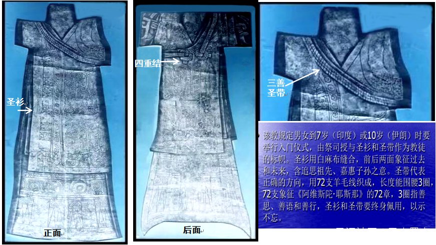 我們會看到,“左衽”衣服胸前有三條帶並排,從肩膀斜着前胸下繞,從肋部往後背延伸,在背後打“四重結”的帶狀物。這是什麼東西?翻遍幾大宗教禮儀(佛教、基督教、伊斯蘭教、中國儒教),都沒有這種胸前纏繞三條帶的標佩。唯有古波斯祆教(拜火教)教規明文規定: