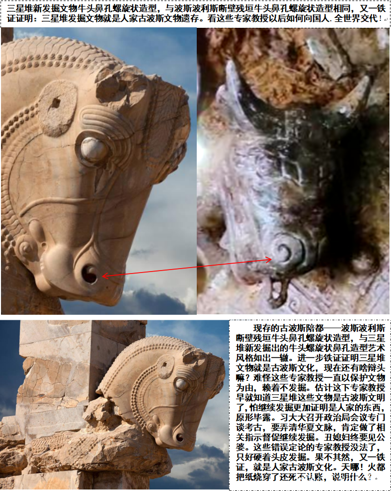 下圖右圖是三星堆最新發掘出的牛頭,螺旋鼻孔藝術造型與左圖現在都還存在的古波斯第二首都波斯波利斯斷壁殘殘垣牛頭螺旋狀鼻孔藝術造型如出一轍,又一鐵證證明三星堆發掘文物與古波斯文物藝術造型風格完全一致。