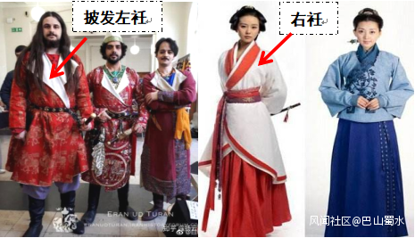 當然,僅僅從相貌上的直觀感覺還不能説明問題。第一步,我們從着裝衣服上證明這是外來民族。看圖2對比。2500年前,我們的聖賢孔夫子,在《論語》中,談到胡人與華夏民族的着裝、外貌區別時,早有論述:“管仲相桓公,霸諸侯,一匡天下,民到於今受其賜。微管仲,吾其被髮左衽矣。