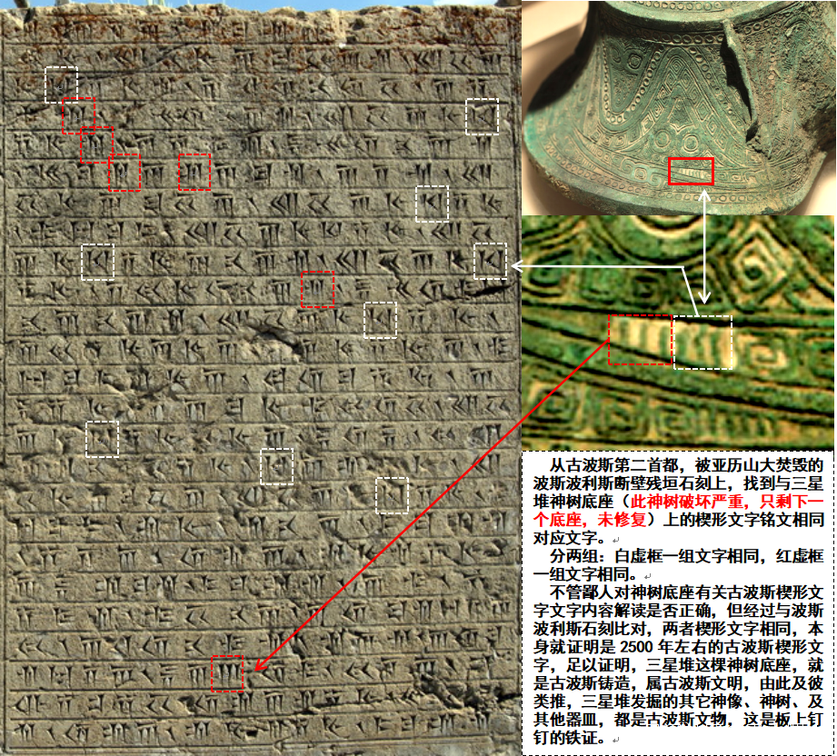 下圖是三星堆出土神樹底座上的古波斯楔形文字銘文,紅白虛框是古波斯楔形文字銘文製造年代為:波斯三世王大流士一世11年(此神樹被破壞的太嚴重無法修復,只剩個底座,經鄙人考證此神樹使生長在水中的“哈瓦伊神樹”)。左面古波斯楔形文字石刻,是現在都還在的,被亞歷山大滅古波斯被摧毀的古波斯第二首都波斯波利斯斷壁殘垣石刻。箭頭左右所示內容為相同文字,鐵證證明三星堆文物就是古波斯文化文物。