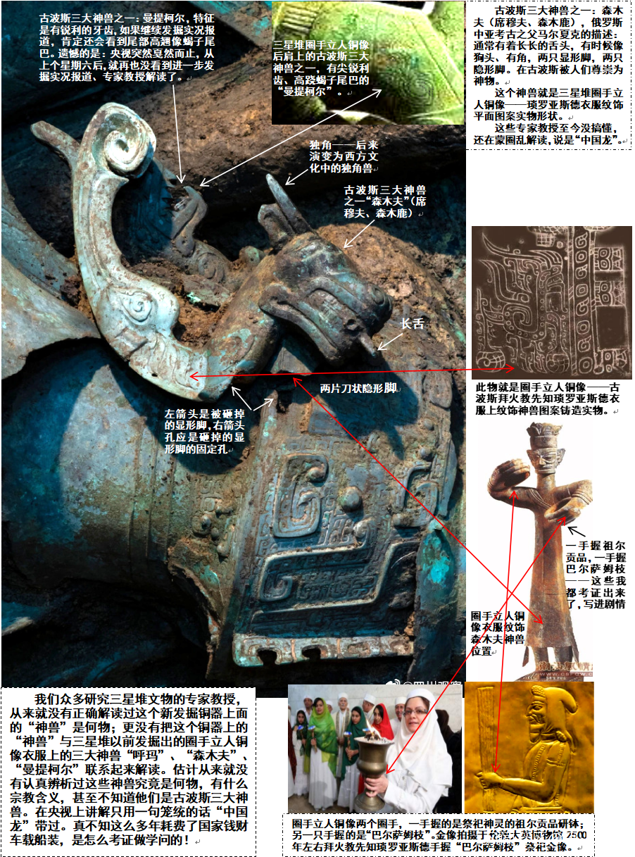 注意**:三星堆新發掘出來的這些文物,專家教授解讀為“中國龍”,其實就是古波斯三大神獸“森木夫”、“曼提柯爾”,現在只差“呼瑪”了。這些古波斯神獸出土,愈證明是古波斯文物。**
