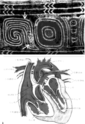 古波斯雅利安人祆教三善核心思想為:善思.善言.善行。與之對立,有惡思.惡言.惡行。故該銅像設計工程師通過6條端頭相互交接,中心閉合,外封閉套內封閉的螺旋線條,表達祆教的核心——三善、三惡對立統一理念。注意看:下端那個上面有網狀、酷似心臟的圖形,表示心血管的相互交織,且有兩條與心臟連接的主線,表示動脈與靜脈左右分佈。對照下圖,與現代生理心臟解剖學完全相符。設計工程師意在通過與心臟解剖學相符的圖形創意,表達祆教核心教義“善思.善言.善行”與“惡思.惡言.惡行”三種相互對立的心理、行為活動,本源皆發自內心,善惡相互交接,對立共生,形影不離,陪伴終生。它將善惡交接螺旋線一端旋轉朝下,一端旋轉向上,定位中心,意在昭示善惡二元對立體系終結原理:如果內心善戰勝惡,人生就會積極向上,進入光明的善界中心,獲得幸福人生。如果人的內心惡戰勝善,人生就會向下,墜入黑暗,進入惡魔世界受苦受罪;這些都符合祆核心教義,由此詮釋了祆教聖經《阿維斯塔》解釋幸福的真諦:“真誠乃是幸福的源泉,幸福屬於渴求至誠之人”——而至誠源自內心,所謂誠心是也。由此可見:銅像設計工程師熟知人體心臟解剖學原理,並且巧妙地運用於詮釋宗教理念,通過簡單的6條螺旋交接線圖形的昭示,令人一看就明白祆教的核心教義:“善思.善言.善行”三善與“惡思.惡言.惡行”三惡相對立,又共生於一體,相互之間的依存關係和終結後果,引導人們棄惡從善。他的對立統一學説表達方式,與中國同時代道家老子採用陰陽魚表達對立統一,矛盾雙方共生於一體關係,有異曲同工之妙。設計工程師將人體解剖學知識與宗教理念相結合,達到一目瞭然的詮釋效果,創意手法之精妙,令人驚歎!