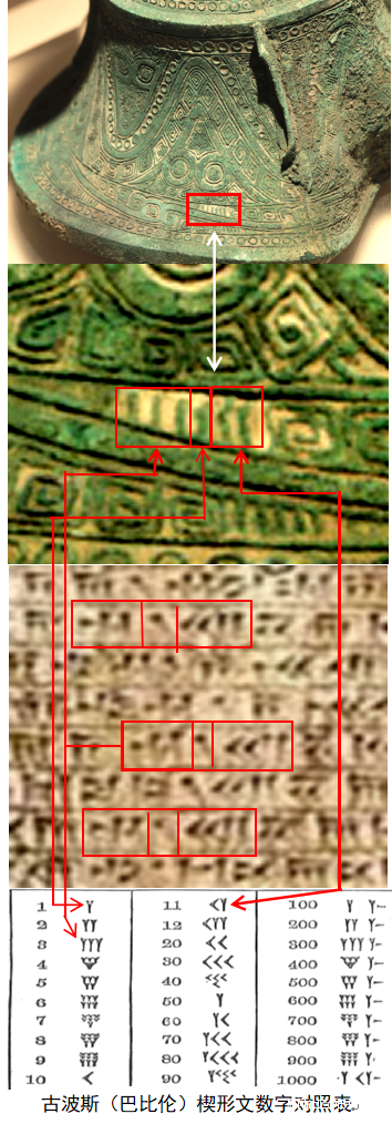 下圖為薛西斯年代楔形文字石刻(薛西斯是波斯3世王大流士1世的兒子),見後面附圖。古波斯居魯士大帝攻佔巴比倫後,沿用巴比倫楔形文字,大流士1世經過改進,成了古波斯文,與巴比倫文大同小異。從石刻中,選擇3組相同文字。3組紅框中的內容是一樣的。這3組相同文字表達意思是:波斯3世王大流士1世22年。前面3個頭大尾小楔形文字表示波斯3世王,斜着的頭大尾小表示大流士1世,後面<<II表示22。對照上圖三星堆神樹底座發現,前四個是一樣的(三豎一斜)。通過類比法,辨析出三星堆神樹底座前四個文字是表示波斯3世王大流士1世。不同的是後面兩組文字。下面紅框裏是兩個<符號和兩豎頭大尾小楔形文字,由下面古波斯楔形文字對照表知道:兩個<<符號實際上兩個10疊加表示20,後面兩豎兩個頭大尾小楔形文字是表示2,聯繫認讀是22。下紅框文字全義是:波斯3世王大流士1世22年。再來看三星堆神樹底座虛線紅框兩個楔形文字是:1個<符號,代表是10,後面1豎,代表是1,聯繫認讀是11,整個銘文含義:**波斯3世王大流士1世11(年)。**也就是説:此神樹鑄造年代,設計工程師已在上面銘文:古波斯3世王大流士1世11年。由此及彼類推,三星堆幾棵神樹、銅像、器皿基本上就是這個年代鑄造的。波斯3世王大流士1世11年是什麼年代?查閲歷史:大流士1世是在公元前522年鎮壓高馬塔當王的。三星堆這批神樹、銅像、器皿等,製造確切年代當是大流士1世當王11年,公元前511年。