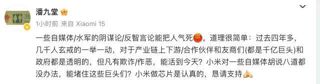 而今天一大早,潘九堂再更新動態:一些自媒體、水軍的陰謀論,反智言論能把人氣死,小米對一些胡説八道沒辦法,能賭注這些巨頭們?