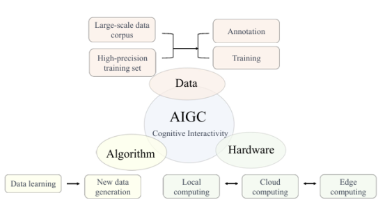 AIGC被認為是繼“專業生成內容(PGC)”和“用户生成內容(UGC)”之後,利用人工智能技術自動生成內容的新型生產方式,它的出現標誌着人工智能進入全新發展時期。AIGC主要由三個關鍵組件組成:數據、硬件和算法。高質量的音頻、文本和圖像等數據是訓練算法的基石,數據集的規模大小將直接影響訓練模型的準確性,通常樣本量越大模型越精準。這就需要硬件系統需能夠處理TB級海量數據以及包含數百萬參數的複雜算法,面對如此龐大的數據量,高性能的芯片與雲計算平台深度整合,為解決這一問題提供了算力保障。