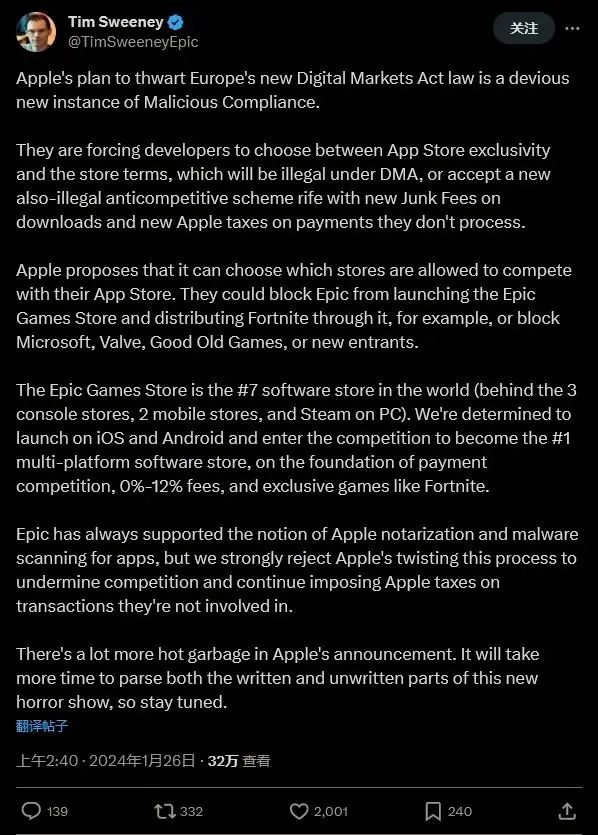 期間一個插曲是,隨着2024 年歐盟《數字市場法案》正式落地,蘋果被迫開放歐洲地區的第三方支付渠道,曾讓Epic看到了《堡壘之夜》重返 App Store 的希望。然而希望轉瞬即逝,Epic開發者賬號遭到蘋果封禁,迴歸之路再次中斷。(https://mp.weixin.qq.com/s/GOEttIA5yokMp66iAtnD3Q)