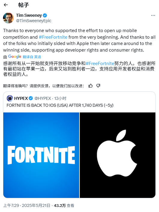 面對法院的壓力,蘋果最終做出讓步。《堡壘之夜》得以於今日正式重返App Store,距離其被下架過去了整整1741天。今天上午,斯維尼在社交媒體上所有支持Epic的玩家。