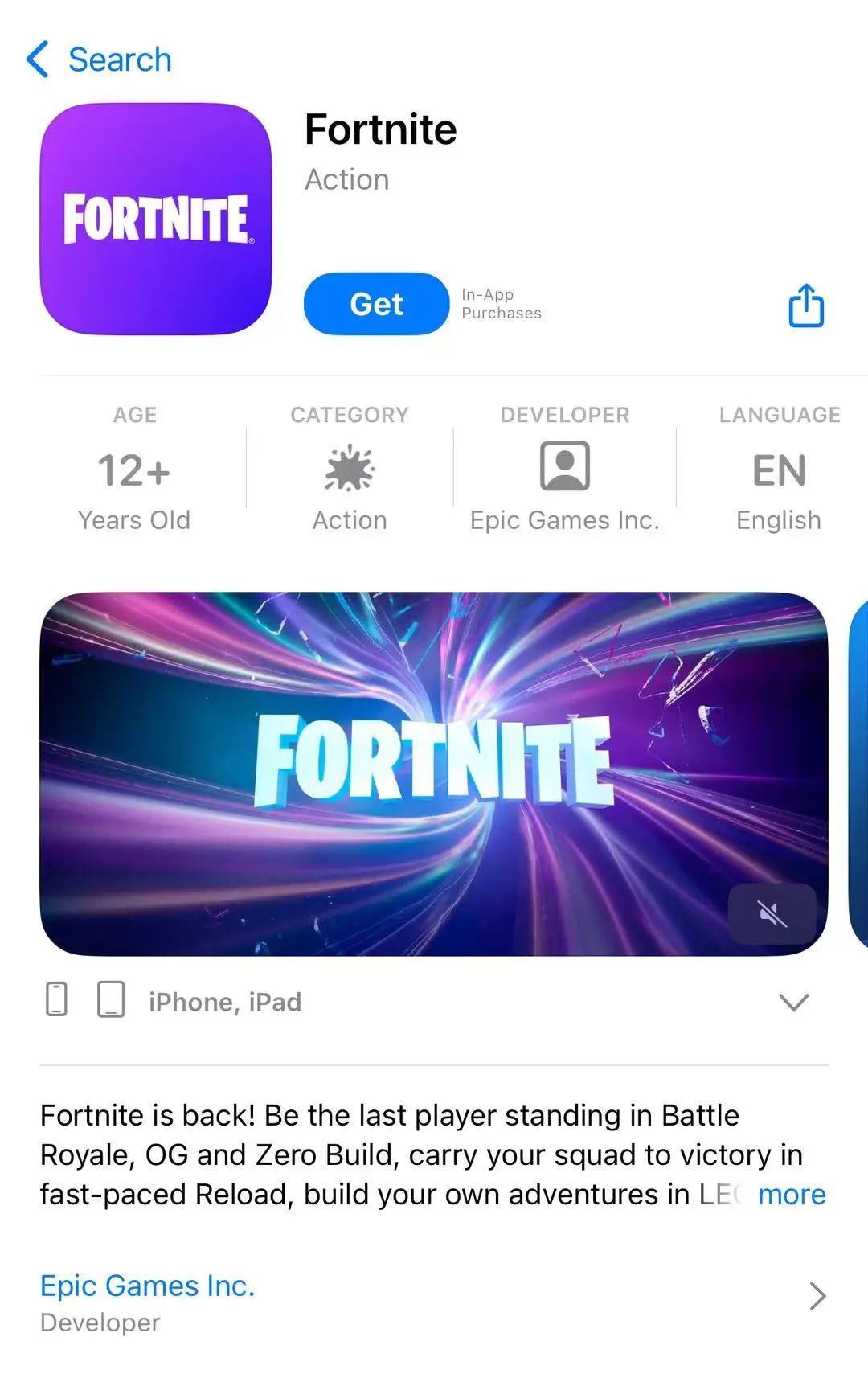 Epic和蘋果的官司還沒打完,但至少現在可以在App Store下載《堡壘之夜》。