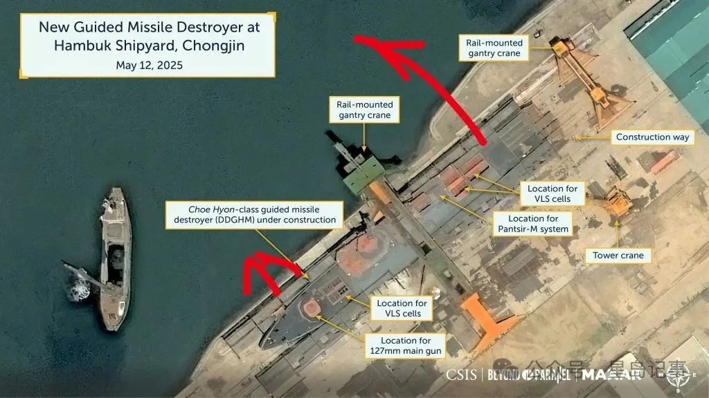 ▲北韓第二艘“崔賢”級驅逐艦下水時失衡,導致船尾落水,艦艏仍留在船台受損。微博@包容萬物恆河水