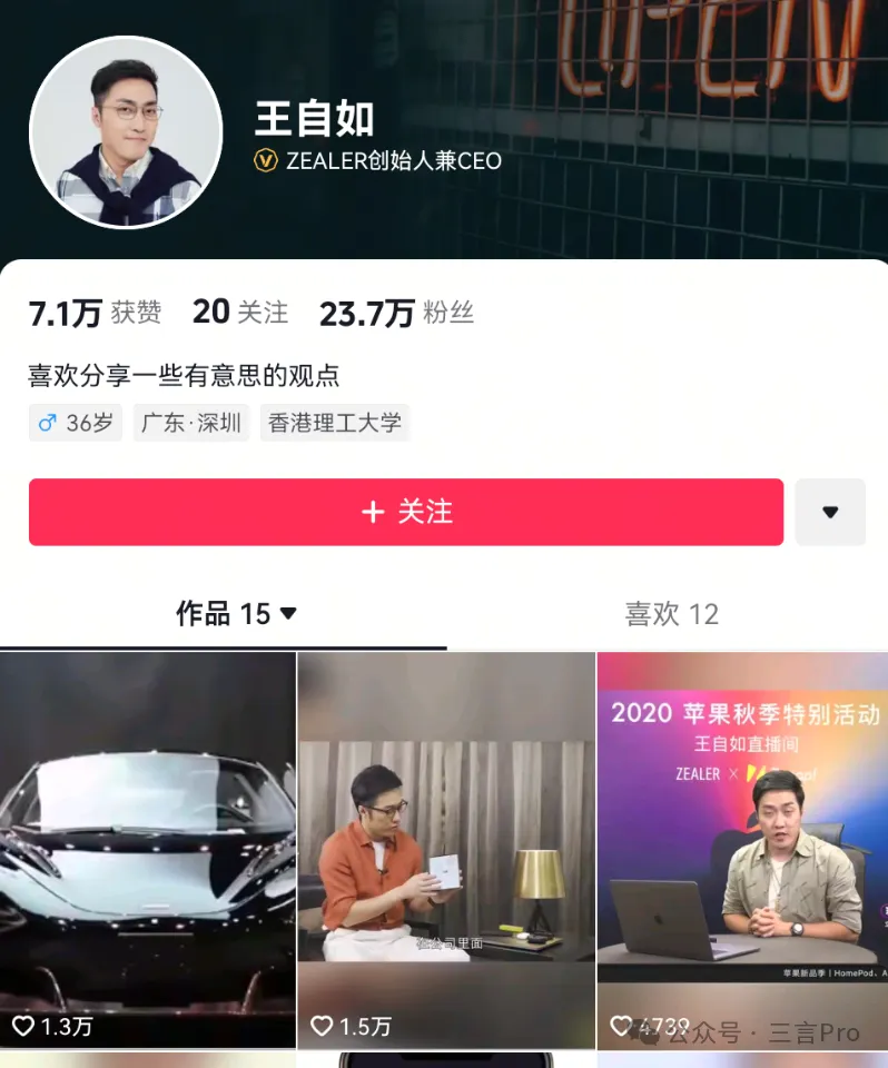 公眾對王自如的身份認知最初來自Zealer,目前Zealer全網粉絲量約在500萬水平,雖然並不低,但也並不突出,影響力已經大不如前。