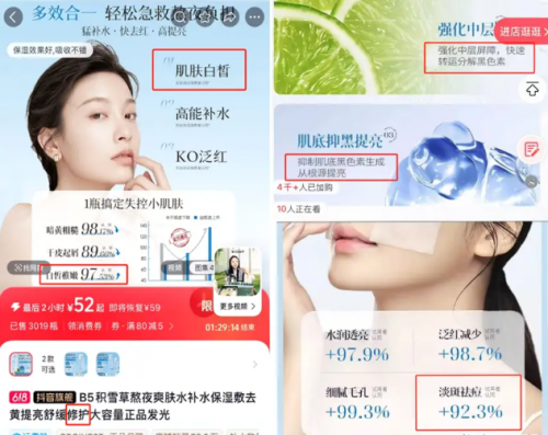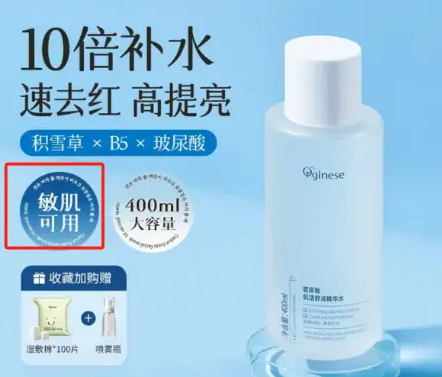 在抖音平台的 Orginese 官方旗艦店,一款名為 “玻尿酸肌活舒潤精華水” 的產品宣傳頁堪稱 “功效狂歡” 現場。“肌膚白皙稚嫩 97.53%”“快速分解黑色素”“淡斑祛痘 + 92.3%” 等極具衝擊力的標語格外醒目,搭配 “敏肌可用”“舒緩修護” 等宣稱,營造出 “全能型護膚神器” 的幻象。然而,經藥監局備案信息核查,這款產品僅是普通的非特殊用途化妝品,備案功效僅標註 “保濕、舒緩”。