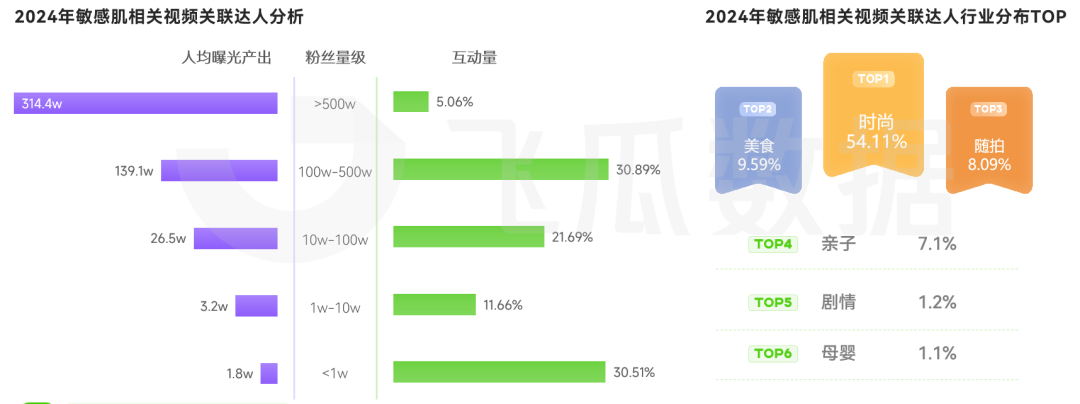 從敏感肌視頻的關聯達人來看,頭部紅人 以314.4w的人均曝光佔據傳播優勢,而腰部達人在互動量上表現更優,更易拉近與受眾距離,實現與用户的深度溝通。