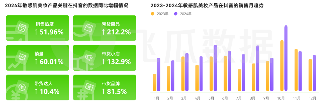 2024年抖音美妝市場中,敏感肌相關產品銷售熱度顯著提升,較去年同期增長 51.96%,且呈逐年遞增態勢。